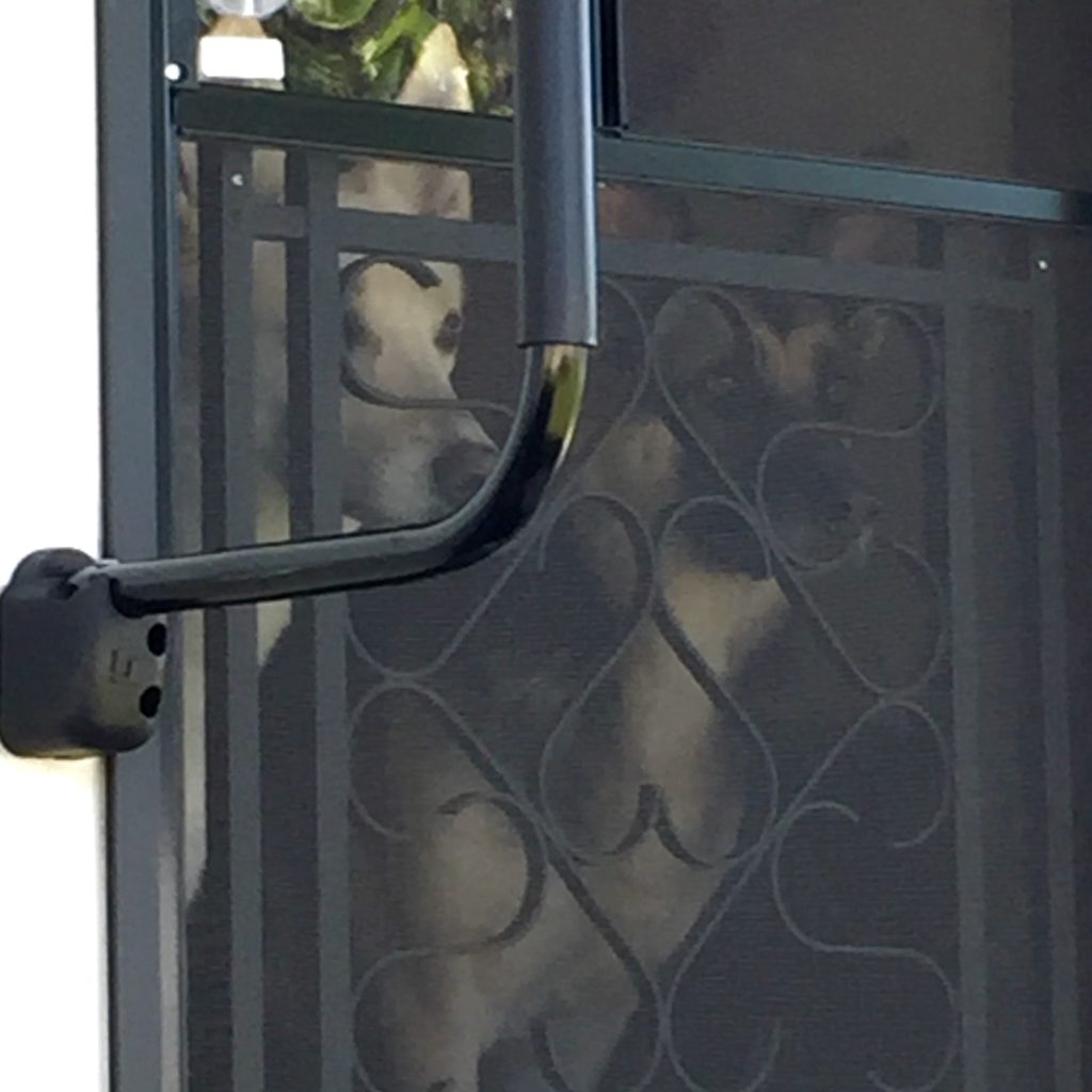 We bought a Camco screen door grill to keep the girls from pushing their noses up against the screen. It probably wouldn’t take much for any dog to push through a travel trailer doors screen. This grill is inexpensive and installes in ten minutes. All you need is a drill and a screwdriver. This was well worth the money we paid for it. I highly recommend this grill to all dog owners.