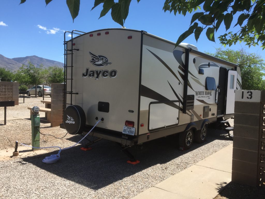Highway 380 is a very nice four lane highway with beautiful views as you cross over the mountains. The road has some nice inclines but they are not as bad as you might think. When we were about thirty miles from the campground we decided to pull into a gas station and fill up, but it wouldn’t have been necessary. Oddly we averaged 12 MPG for the trip to Alamogordo.