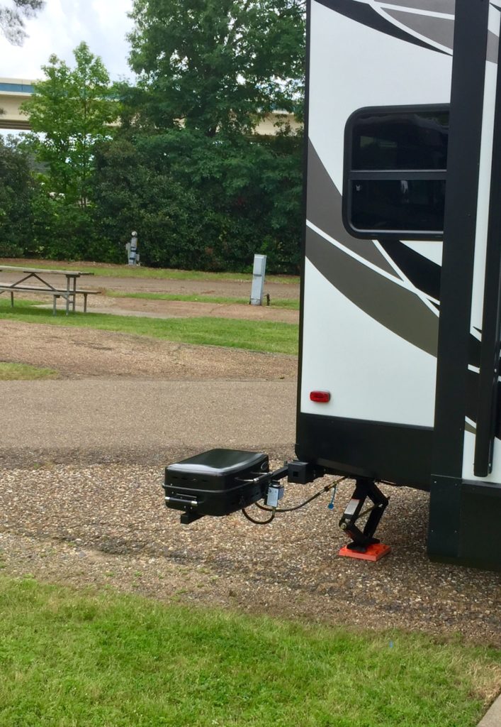 All I wanted was the dealership to run an LP gas line from the existing quick connect port by the front door to the rear of the trailer; so I could use my bumper grill. From their reaction, you would think I asked for a hot tub to be installed. I was willing to pay for this modification. Sadly I just could not find a dealership interested in doing this; and I still can’t figure out why. After all, it was as simple as getting 20 feet of hose and quick connecting it by the door. Next it would be then secured to the frame just as the manufacturer did for all the other gas appliances. Lastly it would be mounted to the rear bumper. Even Tammy wondered “hasn’t anyone every asked for this before…it can’t be their first Rodeo?!!!