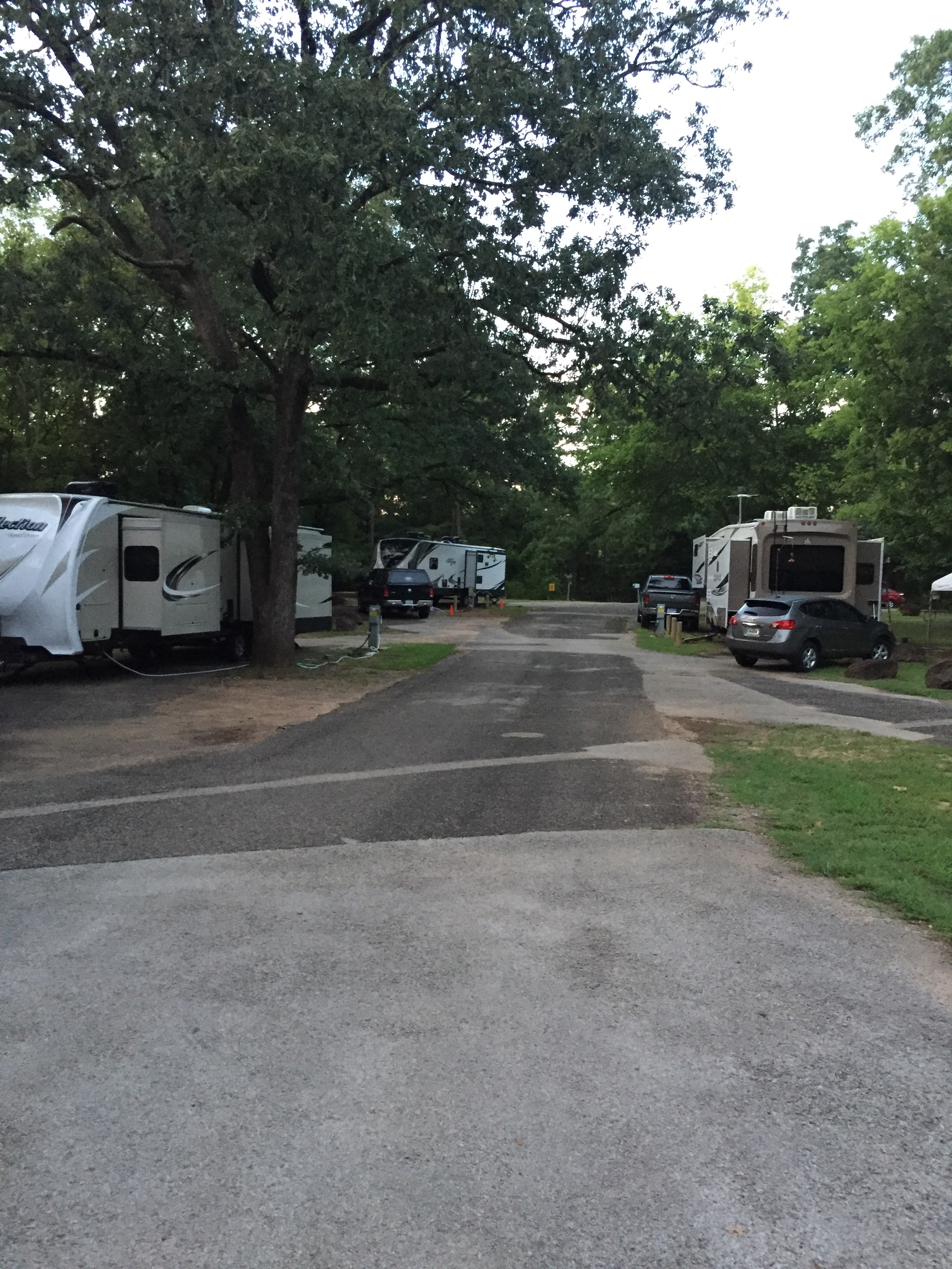 The availability of sites are based on the size of your travel trailer; some are too short for our 34′ trailer but there were plenty to pick from.  The sites may or may not be level, but none of the sites looked like they would be hard to find a way to level the trailer with a leveling block or two.  There are some large rocks and/or cement posts that border the camp sites so you will want to make sure you have clearance not only getting into, but also pulling out of your site.  Almost all the sites have large shade trees and cement pads with picnic tables.  The campground is beautifully maintained.