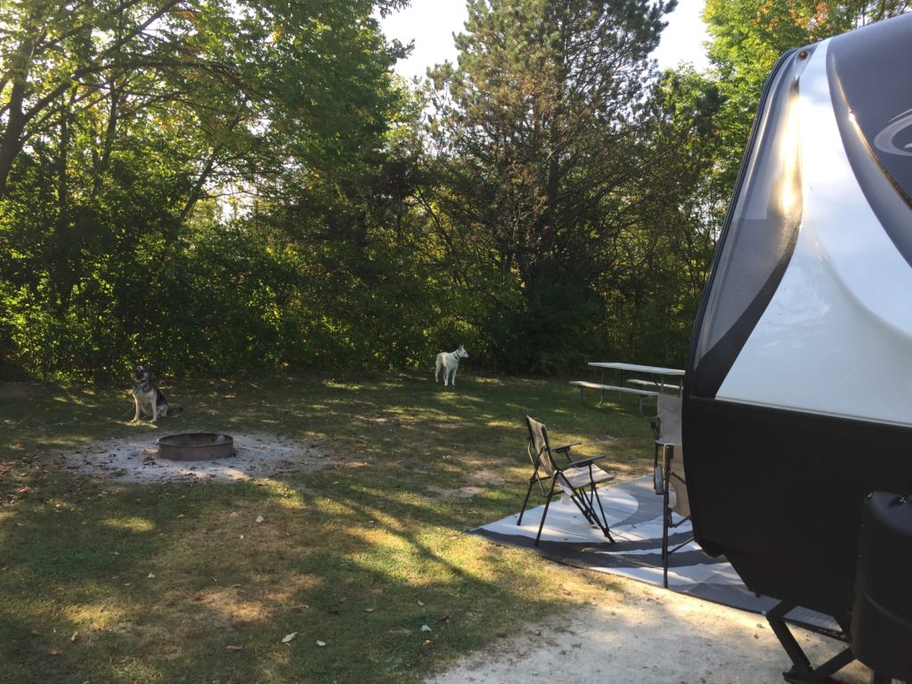 The girls are very smart. They know when we are packing up to leave so doing it very slowly seems to lower their excitement level. When we are at home, and they see me back the camper up; they know what’s happening and can’t contain their excitement. This makes it very hard to pack the camper because they stand at the garage door making it hard to get in and out of the house. It is much better when we are just leaving a campground; because they can just stay in the camper until we are ready to put the slides in.