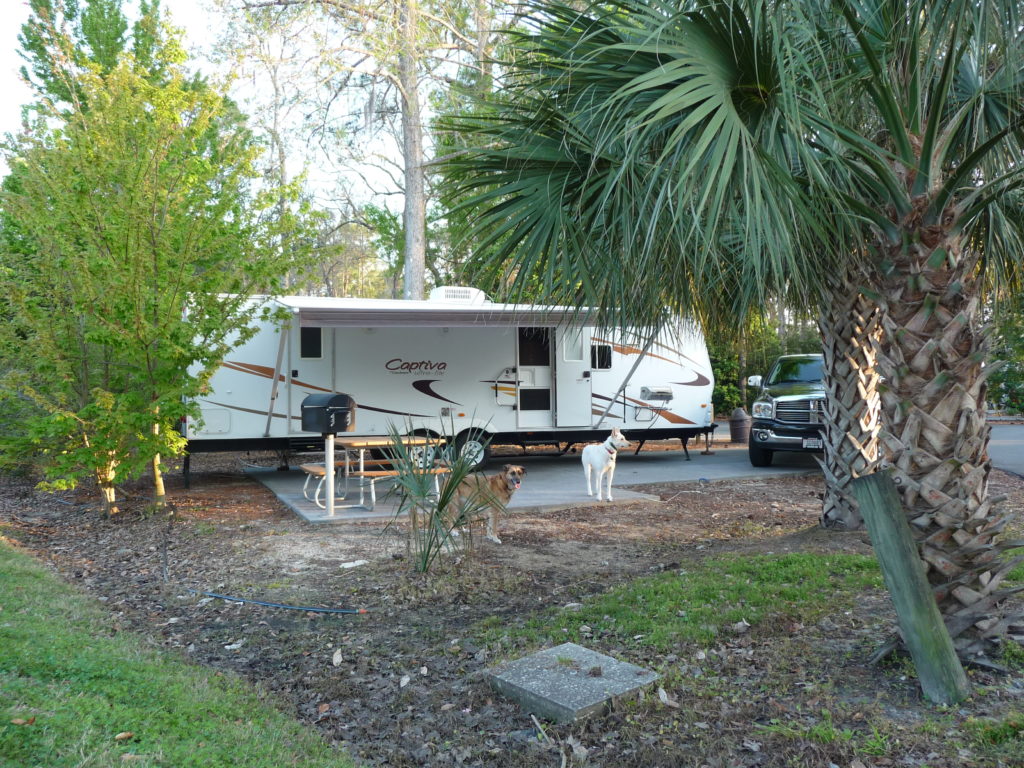 From the picture below you may be able to see the greenway that is directly behind the trailer. This greenway boarders the campsites separated by woods on one side and a river on the other. There are warnings about keeping away from the river as there are alligators and snakes, but I never saw either. The greenway provides a wonderful area to walk your dogs. They even have some dog stations where you can get bags to pick up their poo (if you don’t carry your own – we always do). Our Girls for the most part loved the greenway. Hannah our white shepherd would stay out and walk all day. Kendra our German Shepherd is excited to go for walks; but after a while just wants to get back to her “mommy”.