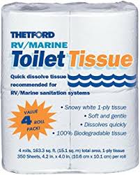 Let me say from the onset that the RV toilet papers we have used during 30 plus years of RVing, and we have used all of them, do what they are intended to do – breakdown. In addition you have choices you can make in the RV toilet paper field; whether it’s a brand name like Thetford, Camco, or Scotts or the thickness (1 or 2 ply). I don’t recommend 1 ply toilet paper, and studies have shown that people that use one ply toilet paper use twice as much as those that purchase 2 ply; so you are not saving money or cutting down on the amount of TP that has to dissolve in your black tank.