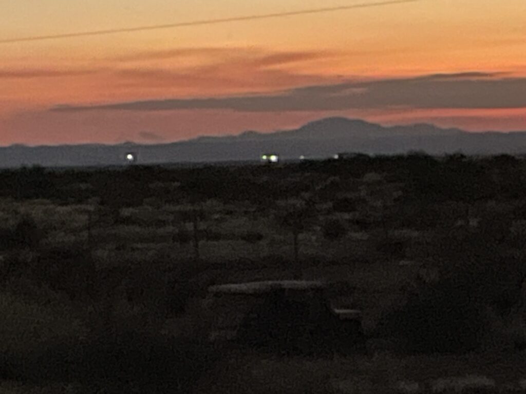 We arrived there as the sun was setting. There were perhaps 20 people in total at the overlook. About 10 minutes after arriving we started seeing lights towards the Chinati mountain range. First there was one, then two, then a couple more. Then one on top of another. It was interesting for sure. I took quite a few videos that we can take a look at now. My camera was in a tripod. I think Tammy and I stayed until about 9 PM and then headed back to the campground.