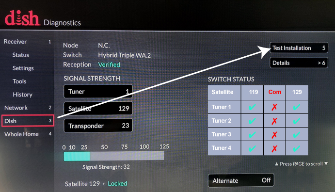 - I typically go to the Wally menu to check system switches, if I have an issue. Do that through the Wally menu on the TV by pressing the little house icon on the Dish remote three times. That takes you to the diagnostic scree. Now scroll down to “Dish” on the bottom of the left side and press enter. Now scroll to the top right of the screen and highlight the Test Installation button and press enter. The Dish will now look for satellites again. This process can take at least five minutes to run. When it is finished it will list received satellite signals with a blue checkmark.