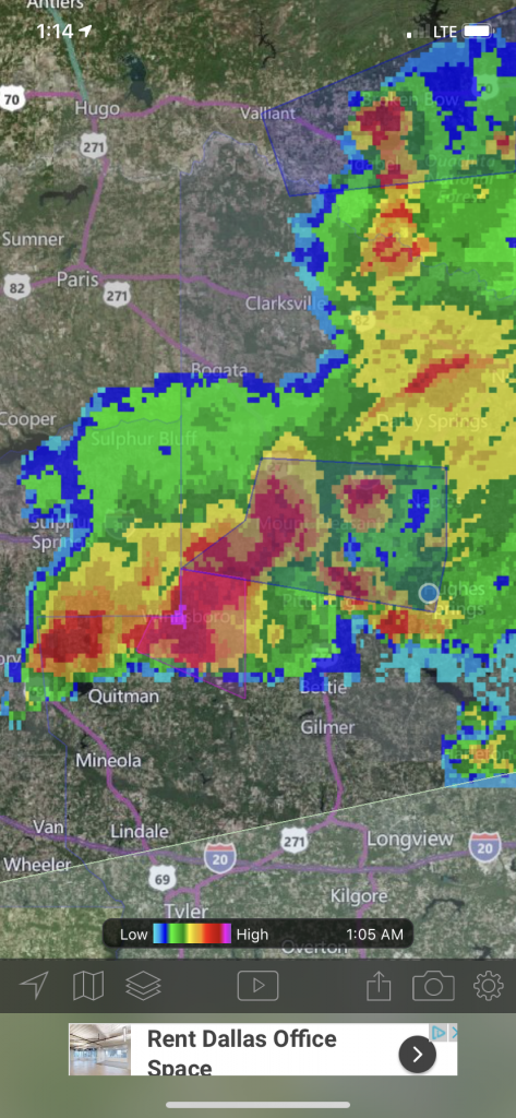 Over the course of the next few hours the storms came our way. As they approached Daingerfield they actually split down the middle and went around us. At this point I was pretty sure we would be spared any bad weather that evening. That all changed at 1:00 AM Monday morning.